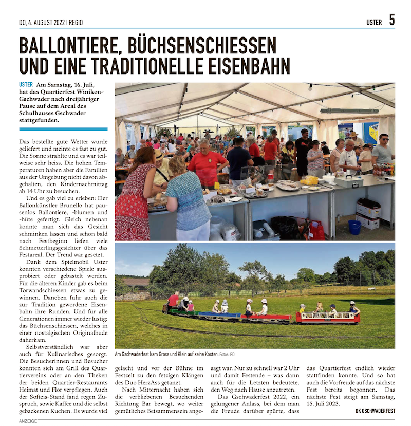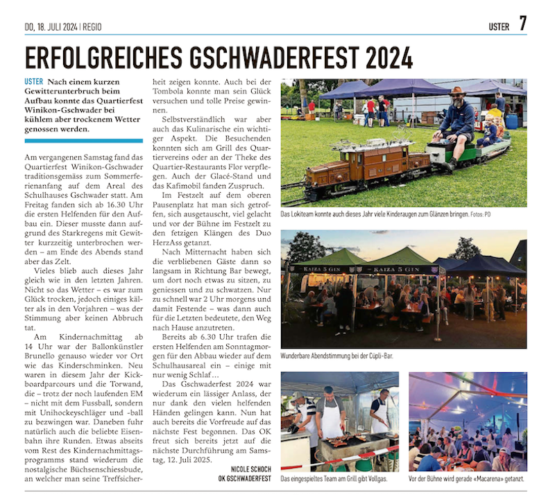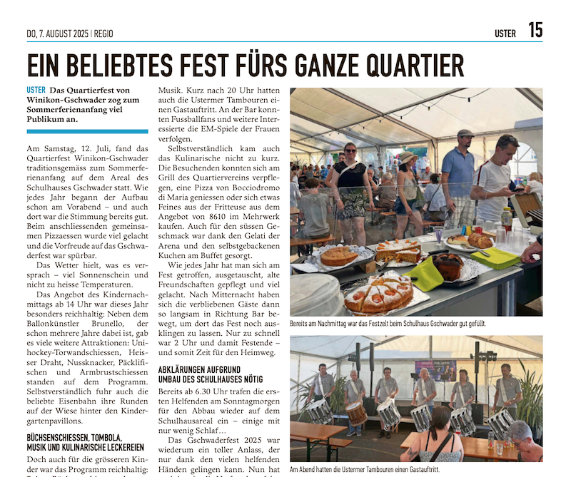 Das Gschwaderfest ist zurück: «Am Samstag, 16. Juli, hat das Quartierfest Winikon-Gschwader nach dreijähriger Pause auf dem Areal des Schulhauses Gschwader stattgefunden.» Mehr...