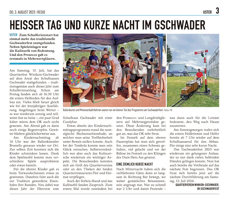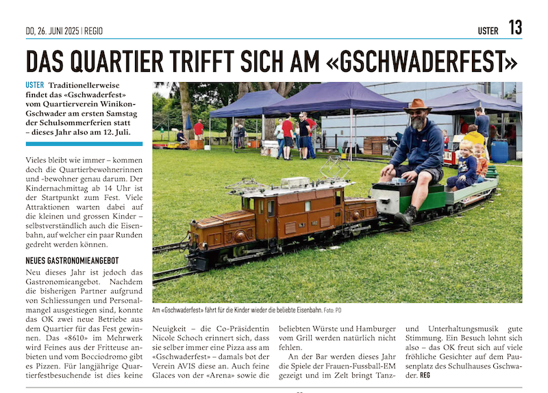 Das Quartier trifft sich am Gschwaderfest: «Traditionellerweise findet das Gschwaderfest vom Quartierverein Winikon-Gschwader am ersten Samstag der Schulsommerferien statt – dieses Jahr also am 12. Juli.» Mehr...
